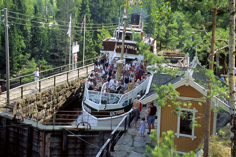 Ausflugsdampfer, Baum, Bauwerk, Dampfer, Fahrzeug, Flora, Gebäude, Gewässer, Haus, Kanal, Landschaft, Norwegen, Ort, Park, Person, Schiff, Schleuse, Schleusenwärterhaus, Telemark, Telemarkkanal, Verkehrsmittel, Verkehrsweg, Vrangfoss, Wald, Wasserfahrzeug,