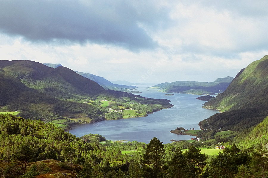Berg, Berghang, Fjord, Gebirge, Gewässer, Landschaft, Møre og Romsdal, Norwegen, Wald, Wiese, Årvåg, Årvågsfjorden,