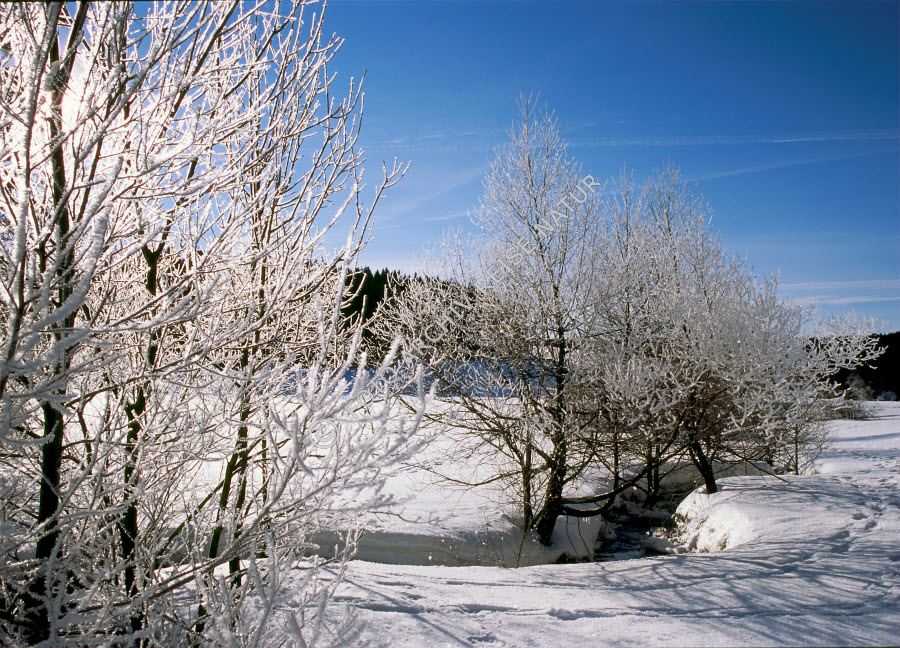 Bach, Baden-Württemberg, Baum, Deutschland, Farbe, Flora, Gewässer, Gutachquelle, Landschaft, Niederschlag, Rauhreif, Schnee, Schwarzwald, Schönwald, Strauch, Weiden, Salix, Weidengewächs, Wetter, Klima, weiß,