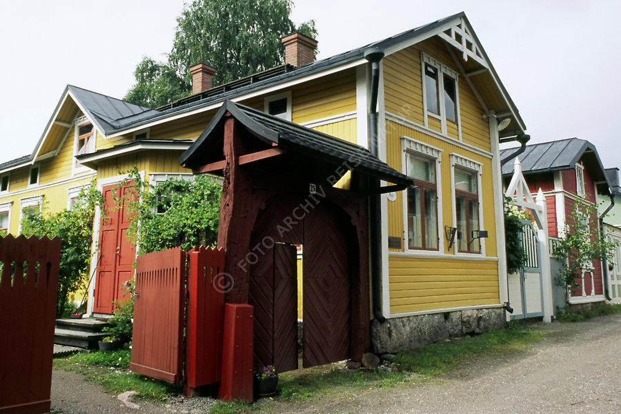 Bauwerk, Einfriedung, Farbe, Finnland, Gebäude, Gebäudeteil, Haus, Holzhaus, Holztor, Holztür, Holzzaun, Lattenzaun, Rauma, Tor, Torbogen, Tür, Westfinnland, Zaun, gelb, rot, weiß,