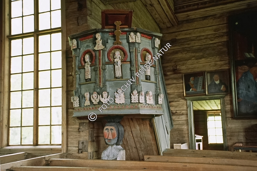 Bauwerk, Finnland, Gebäude, Holzkirche, Holzskulptur, Kanzel, Kirche, Kirchenkanzel, Kultur, Kunst, Ort, Petäjävesi, Sakralbau, Skulptur, Westfinnland,