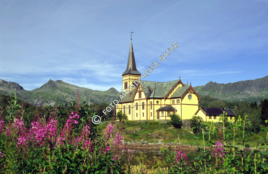 Austvågøya, Baustil, Bauwerk, Berg, Bergkette, Gebirge, Gebäude, Holzkirche, Kabelvåg, Kirche, Landschaft, Lofoten, Neugotik, Nordland, Norwegen, Sakralbau,