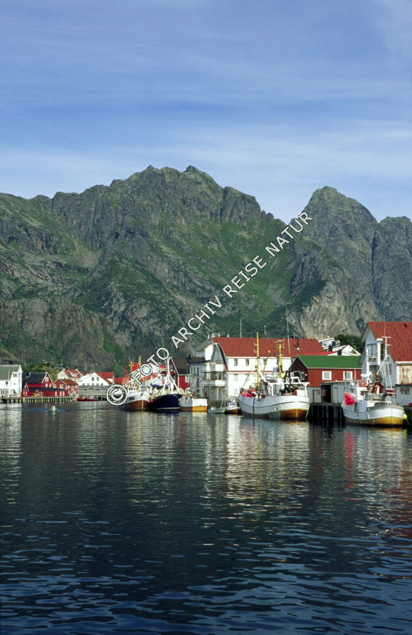 Austvågøya, Bauwerk, Berg, Bergkette, Fischereihafen, Fjord, Gebirge, Gewässer, Hafen, Henningsvær, Landschaft, Lofoten, Nordland, Norwegen, Vestfjorden,