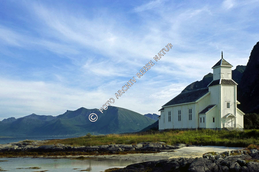 Bauwerk, Berg, Bergkette, Gebirge, Gebäude, Gewässer, Gezeitenstrom, Gimsøy, Gimsøysand, Gymsøystraumen, Holzkirche, Kirche, Landschaft, Lofoten, Meeresströmung, Nordland, Norwegen, Sakralbau,
