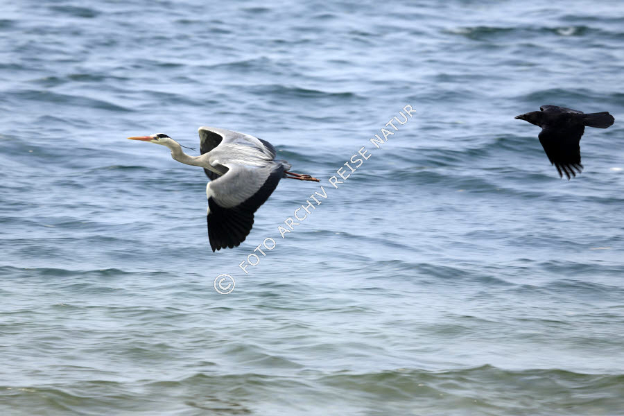 Fauna, Gewässer, Graureiher, Ardea cinera, Lago Maggiore, Landschaft, Rabenkrähe, Corvus corone corone, Rabenvögel, Reiher, See, Vogel,