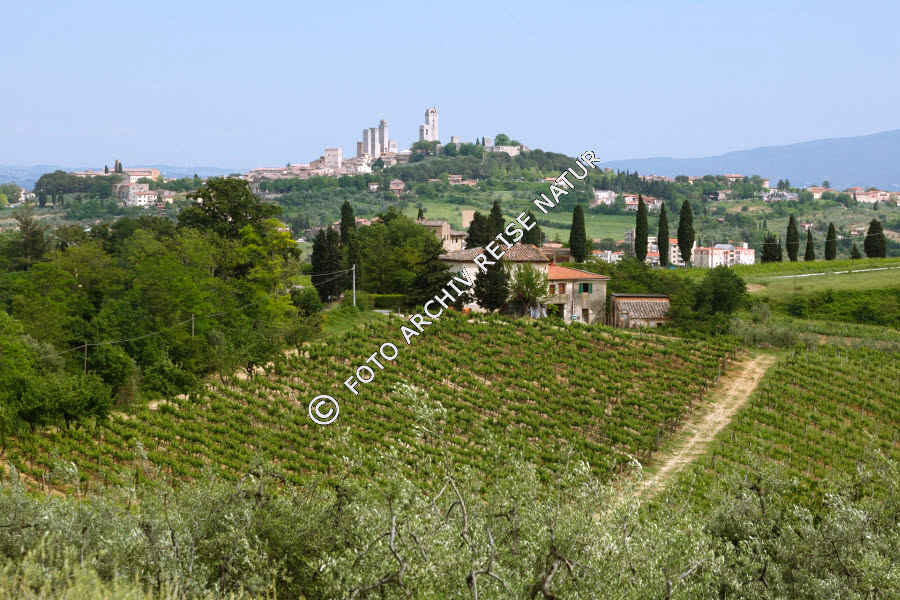 Baum, Flora, Italien, Kulturlandschaft, San Gimignano, Stadt, Stadtansicht, Toskana, Weinberg, Zypresse, Cupressus, Zypressengewächs,