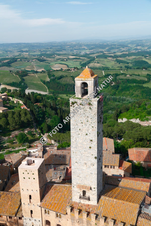Altstadt, Bauwerk, Feld, Hügel, Hügelland, Italien, Kulturlandschaft, Landschaft, Rathausturm, San Gimignano, Stadt, Toskana, Turm,