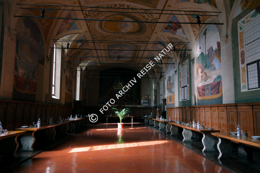 Abtei, Kloster, Bauwerk, Crete, Fresko, Gebäude, Gegenstand, Gemälde, Italien, Kultur, Kunst, Monte Oliveto, Möbel, Refektorium, Sakralbau, Tisch, Toskana,