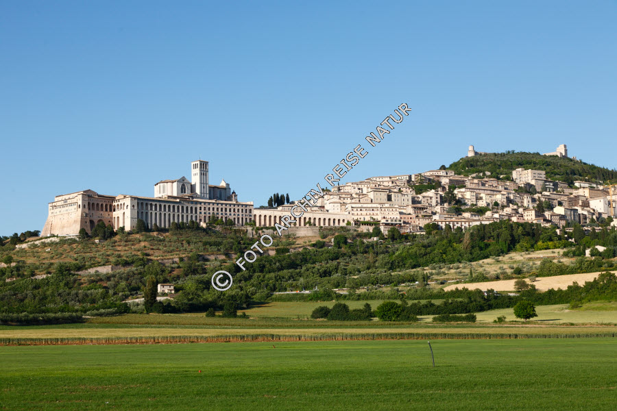 Abtei, Kloster, Assisi, Baum, Bauwerk, Flora, Gebäude, Hügel, Italien, Kirchturm, Klosterkirche, Kulturlandschaft, Landschaft, Sakralbau, Stadt, Stadtansicht, Turm, Umbrien, Wiese,