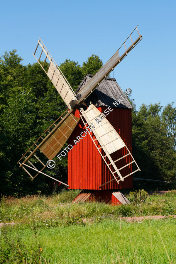 Baum, Bauwerk, Bovik, Farbe, Finnland, Flora, Gebäude, Hammarland, Kulturlandschaft, Landschaft, Mühle, Wald, Wiese, Windmühle, rot, Åland,