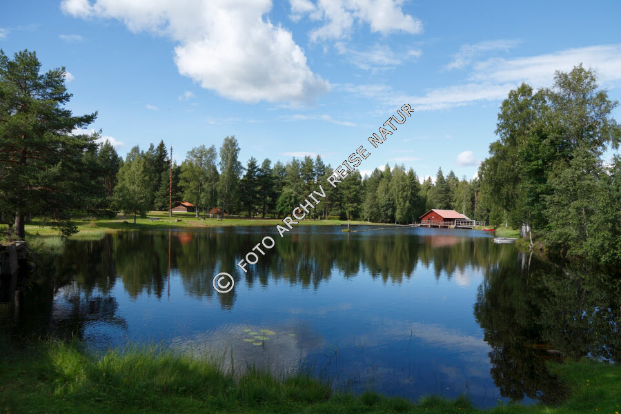 Baum, Bauwerk, Dalarna, Flora, Gebäude, Gewässer, Hütte, Landschaft, Schweden, Teich, Wald,