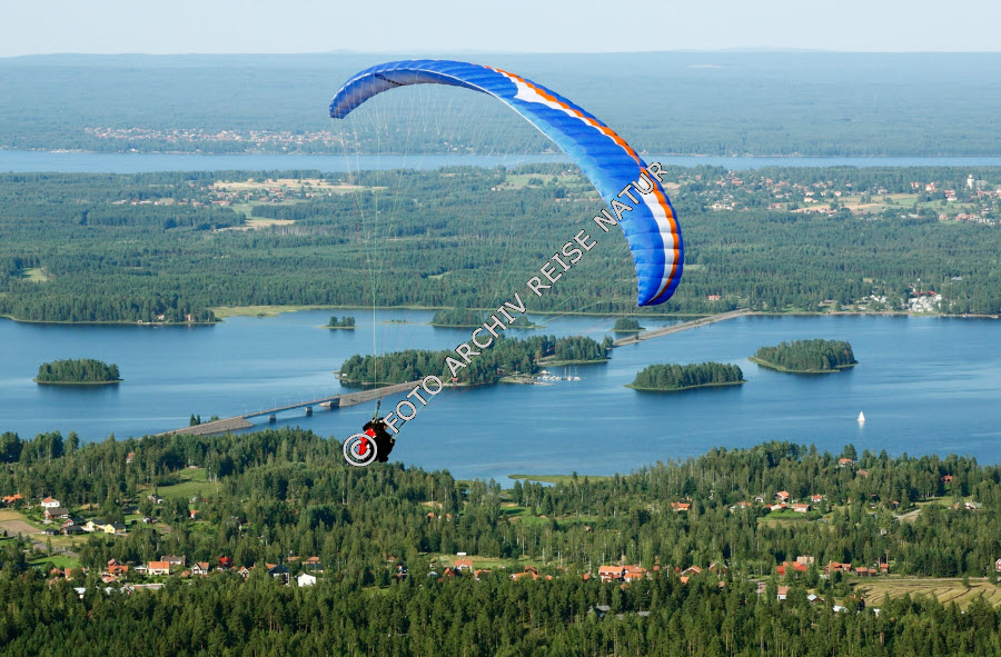 Aktivität, Dalarna, Ereignis, Freizeit, Freizeitsportler, Gesunda, Gesundaberget, Gewässer, Gleitschirmfliegen, Insel, Landschaft, Mora, Person, Schweden, See, Siljan, Sportler, Wald,