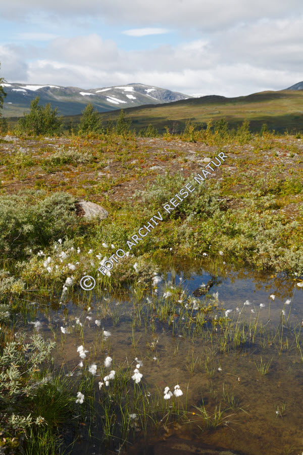 Bergkette, Bergmassiv, Feuchtgebiet, Fjell, Flora, Gebirge, Gras, Hochmoor, Jämtland, Landschaft, Moor, Sauergrasgewächs, Schmalblättriges Wollgras, Eriophorum angustifolium, Schweden, Stekenjokk,
