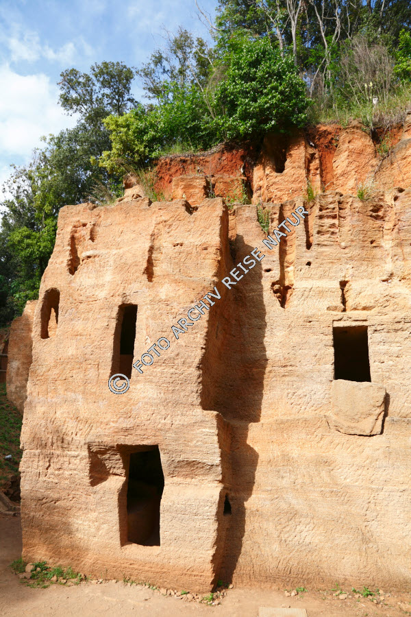 Baum, Ethnologie, Etrusker, Felsen, Felswand, Flora, Friedhof, Grab, Höhlengrab, Italien, Kultur, Material, Nekropole, Ort, Stein, Strauch, Toskana, Volk, Wissenschaft,
