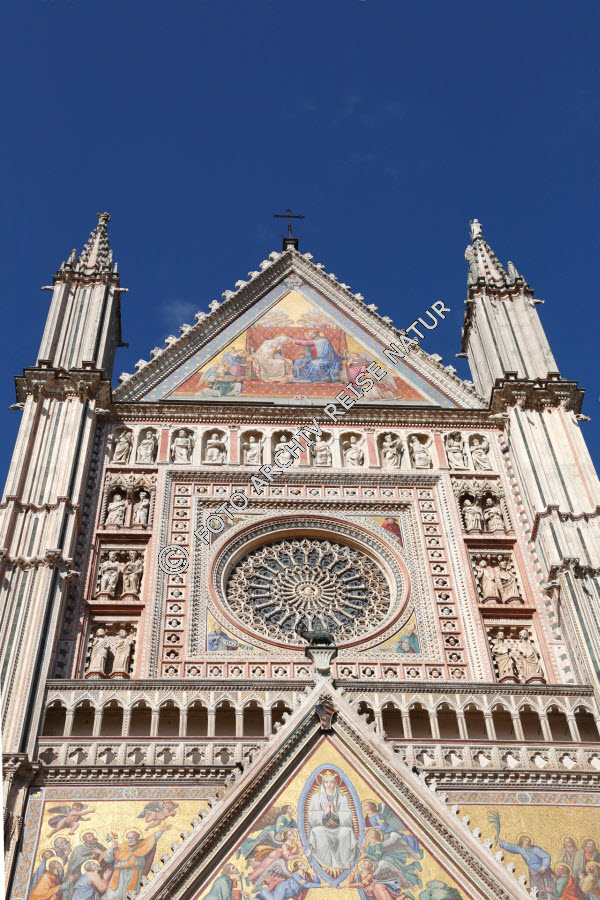 Bauwerk, Dom, Fenster, Fensterrose, Galerie, Gebäude, Gebäudeteil, Himmel, Italien, Kirche, Kultur, Kunst, Mosaik, Orvieto, Pfeiler, Plastik, Sakralbau, Strebepfeiler, Umbrien, Wimperg,