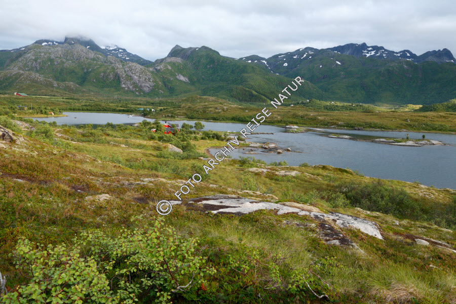Austvågøya, Bauwerk, Bergkette, Bergmassiv, Felsen, Fischerhütte, Fjell, Fjord, Gebirge, Gebäude, Gewässer, Hütte, Landschaft, Lofoten, Material, Nordland, Norwegen, Sandsletta, Stein,