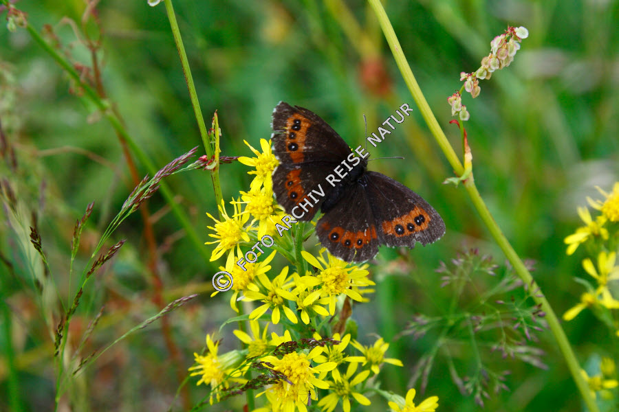 Austvågøya, Blume, Blüte, Fauna, Flora, Goldrute, Solidago virgaurea, Graubindiger Mohrenfalter, Erebia aethiops, Insekt, Korbblütler, Lofoten, Nordland, Norwegen, Pflanzenteil, Schmetterling, Svolvær,