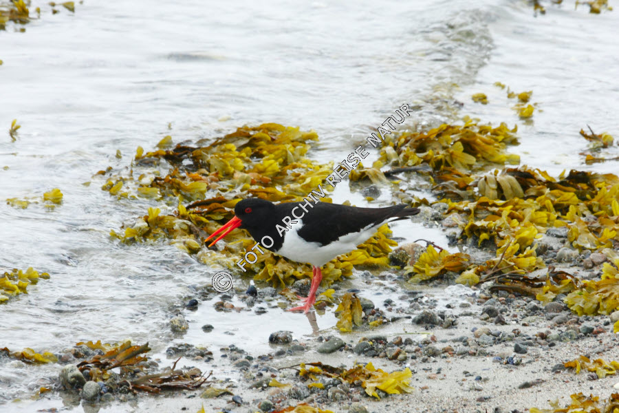 Algen, Austernfischer, Haematopus ostralegus, Blasentang, Fucus vesiculosus, Fauna, Fjord, Flora, Gewässer, Grunnførfjorden, Landschaft, Seetang, Vogel, Watvogel,