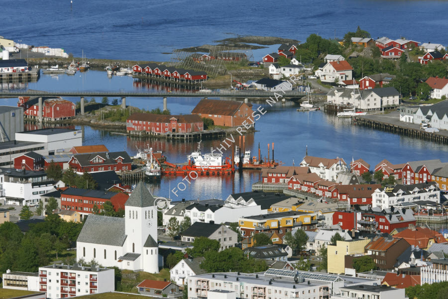 Austvågøya, Bauwerk, Berg, Brücke, Fischerhütte, Fjord, Gebäude, Gegenstand, Gestell, Gewässer, Hafen, Haus, Holzhaus, Hütte, Kirche, Kulturlandschaft, Landschaft, Lofoten, Nordland, Norwegen, Rorbu, Sakralbau, Schiffswerft, Stadt, Stadtansicht, Steinhaus, Steinkirche, Stockfisch-Trockengestell, Svolvær, Tjeldbergtinden, Verkehrsweg, Vestfjorden,