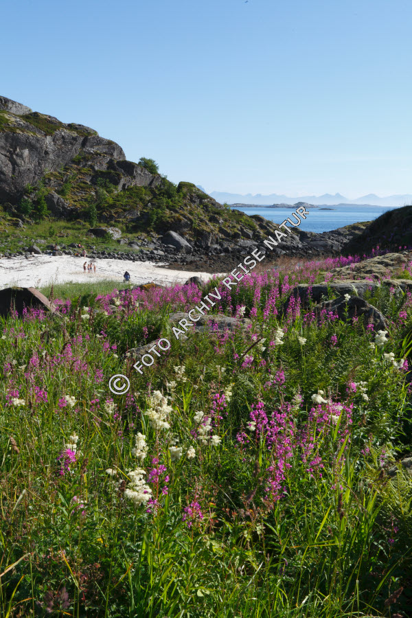 Bergkette, Bergmassiv, Blume, Felsen, Fjord, Flora, Gebirge, Geröll, Gewässer, Insel, Insel Årsteinen, Landschaft, Lofoten, Material, Nachtkerzengewächs, Nordland, Norwegen, Sandstrand, Schmalblättriges Weidenröschen, Epilobium angustifolium, Stein, Strand, Vestfjorden,