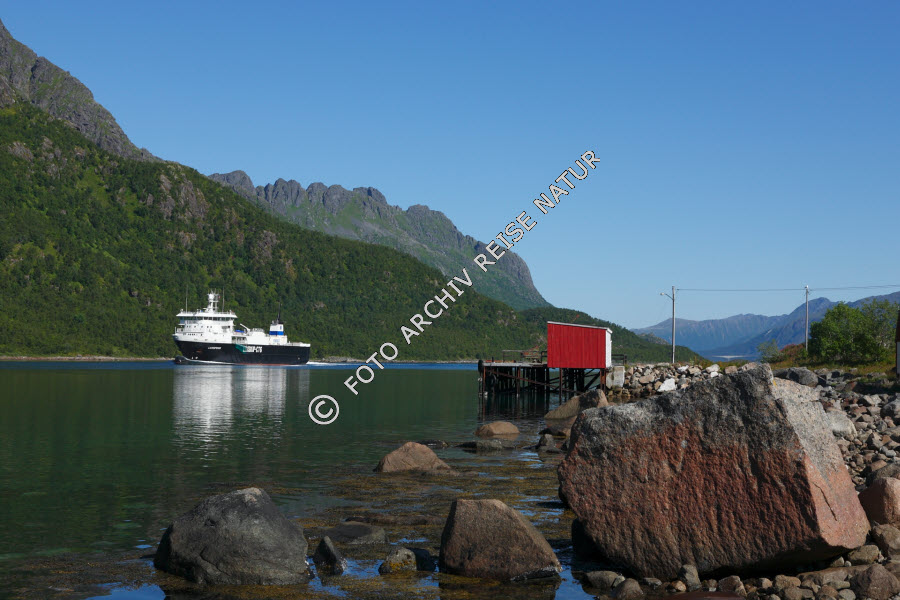 Bauwerk, Berg, Berghang, Bergwald, Felsblock, Felsen, Geröll, Gewässer, Landschaft, Material, Nord-Austvågøy, Nordland, Norwegen, Raften, Raftsundet, Schiffsanleger, Stein, Sund, Vesterålen, Wald,