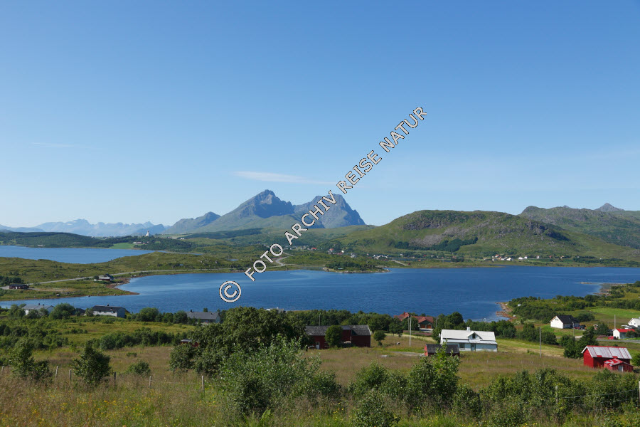 Bauernhof, Baum, Bauwerk, Berg, Bodden, Borge, Dorf, Flora, Gebäude, Gewässer, Gras, Hof, Kulturlandschaft, Landschaft, Lofoten, Nordland, Norwegen, Strauch, Straße, Verkehrsweg, Vestvågøy, Weide, Weiler,