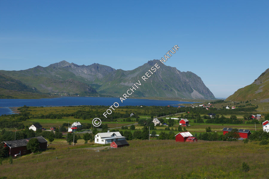 Bauernhof, Baum, Bauwerk, Berg, Bodden, Borge, Dorf, Flora, Gebäude, Gewässer, Gras, Hof, Kulturlandschaft, Landschaft, Lofoten, Nordland, Norwegen, Strauch, Vestvågøy, Weide, Weiler,