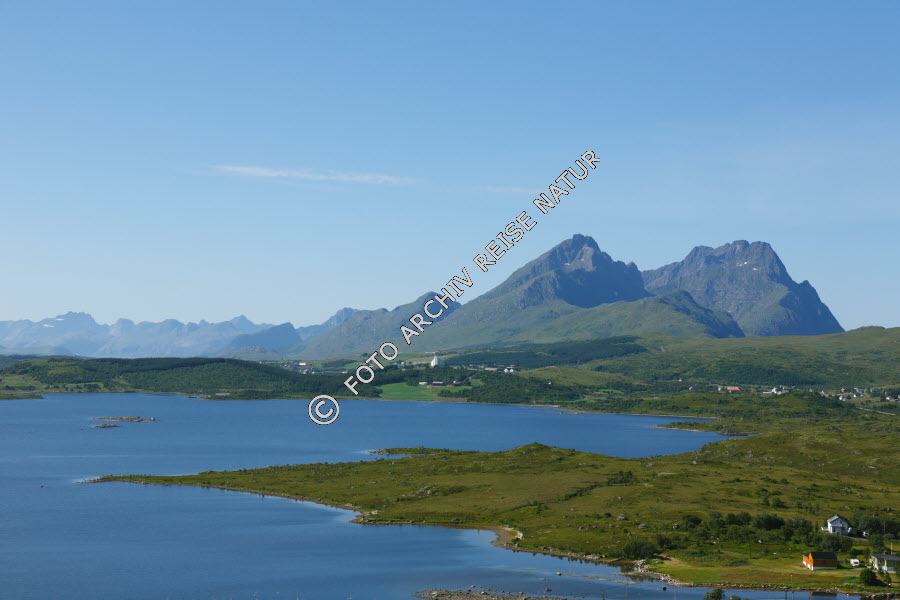 Bauwerk, Berg, Bodden, Borge, Dorf, Gebäude, Gewässer, Kirche, Kulturlandschaft, Landschaft, Lofoten, Nordland, Norwegen, Sakralbau, Vestvågøy, Wald, Weide,