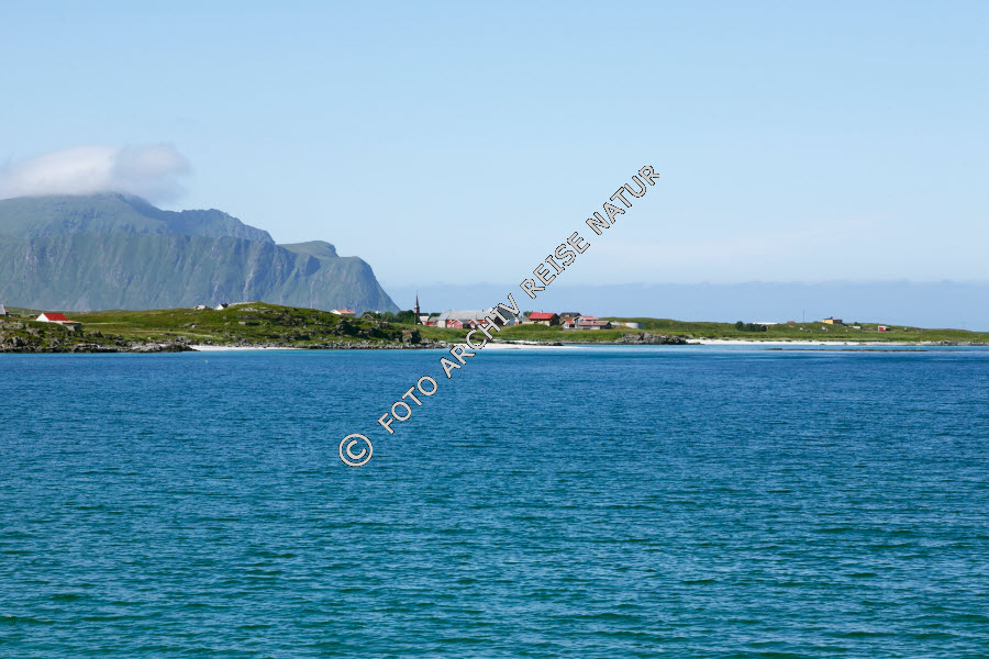Bauwerk, Berg, Dorf, Flakstad, Flakstadøy, Gewässer, Kirchturm, Kulturlandschaft, Landschaft, Lofoten, Nordland, Norwegen, Sandstrand, Strand, Sund, Turm, Vareidsundet,