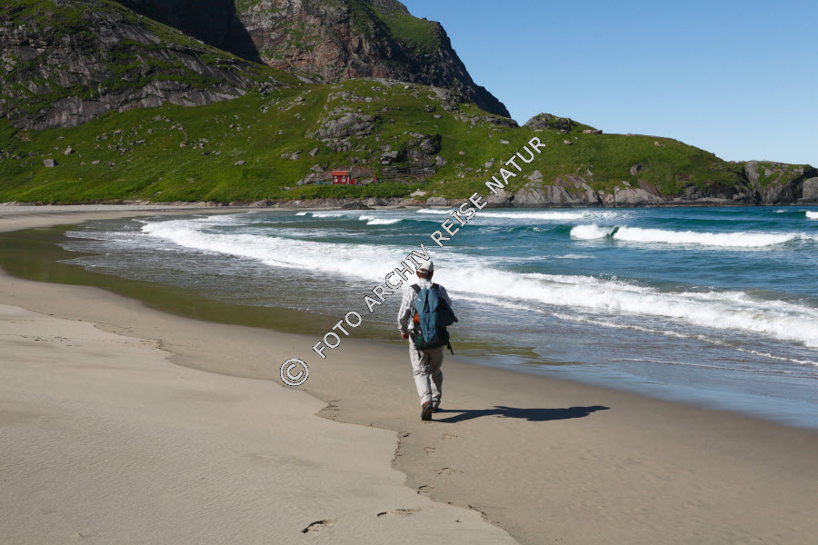 Bauwerk, Buneset, Felsen, Ferienhaus, Gebäude, Gewässer, Haus, Holzhaus, Landschaft, Lofoten, Material, Meer, Moskenesøy, Nordland, Nordmeer, Norwegen, Person, Sandstrand, Stein, Strand, Wanderer,