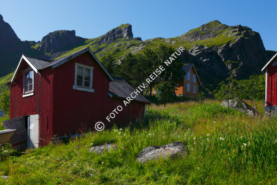 Bauwerk, Berg, Flora, Gebäude, Gras, Haus, Holzhaus, Landschaft, Lofoten, Moskenesøy, Nordland, Norwegen, Vindstad,