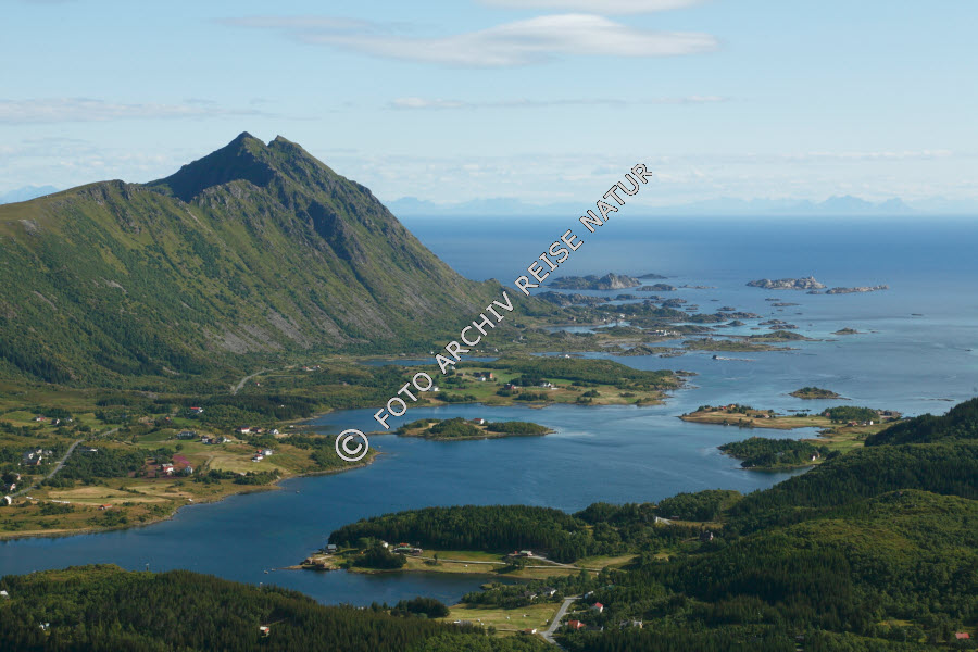 Bauwerk, Berg, Bodden, Fjord, Gewässer, Insel, Kulturlandschaft, Landschaft, Lofoten, Nordland, Norwegen, Schäre, Steinheia, Storfjorden, Straße, Verkehrsweg, Vestfjorden, Vestvågøy, Wald, Wiese,