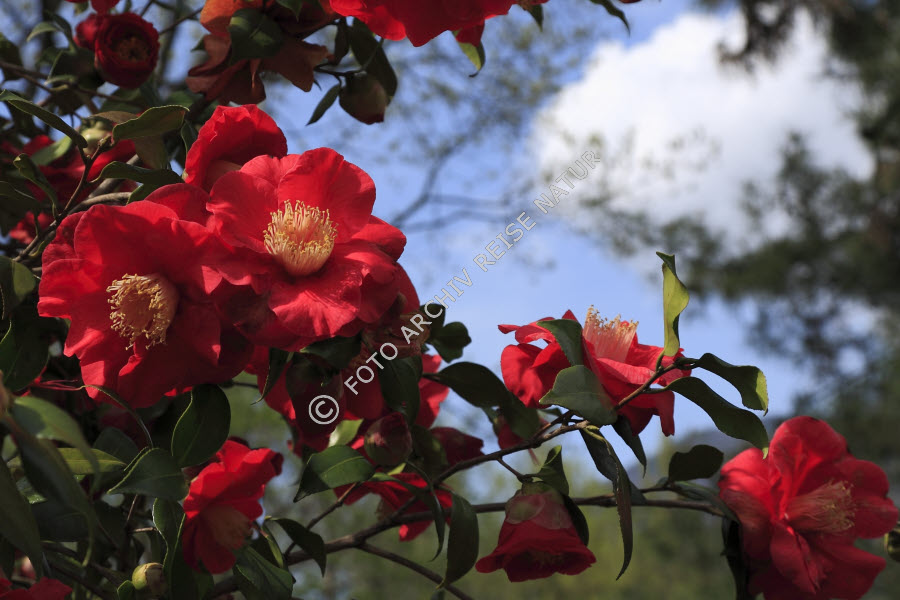 Blume, Farbe, Flora, Kamelie, Camellia japonica, Lago Maggiore, Locarno, Pflanzenteil, Schweiz, Teestrauchgewächs, Tessin, rot,