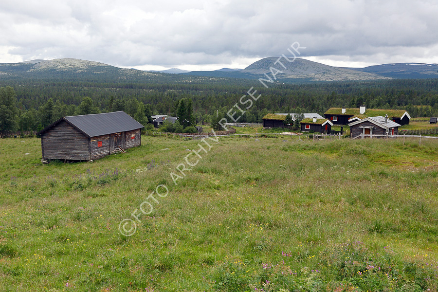 Alm, Bauwerk, Gebirge, Gebäude, Holzhütte, Hütte, Kulturlandschaft, Landschaft, Norwegen, Oppland, Skjerdingen, Wald, Weide,