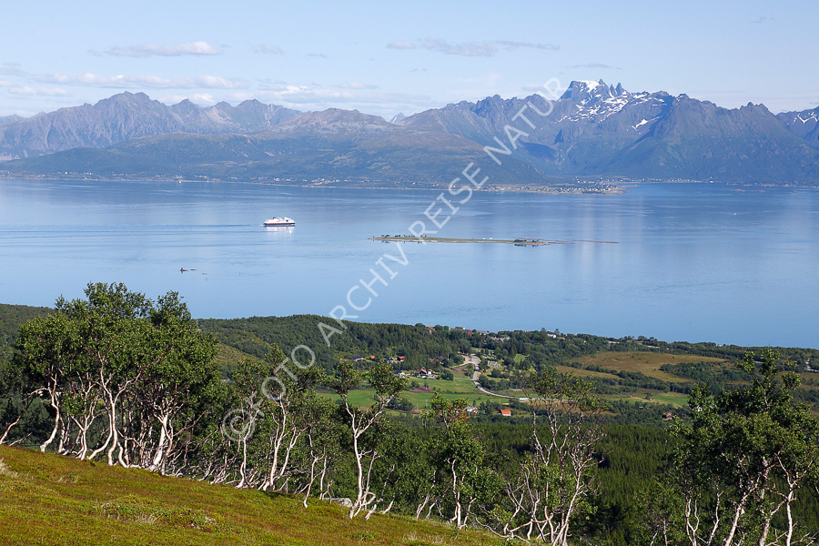 Baum, Berg, Bergkette, Birke, Betula, Birkengewächs, Fjell, Fjellbirke, Betula pubescens, Fjord, Flora, Gebirge, Gewässer, Hadselfjorden, Hadseløya, Landschaft, Nordland, Norwegen, Vesterålen, Ørnheia,