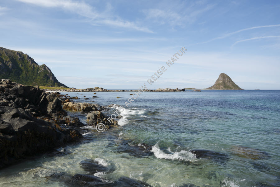 Andøya, Berg, Bleik, Felsen, Felseninsel, Felsküste, Felswand, Gewässer, Insel, Küste, Landschaft, Material, Meer, Naturreservat Bleiksmorenen, Nordland, Nordmeer, Norwegen, Stein, Vesterålen,