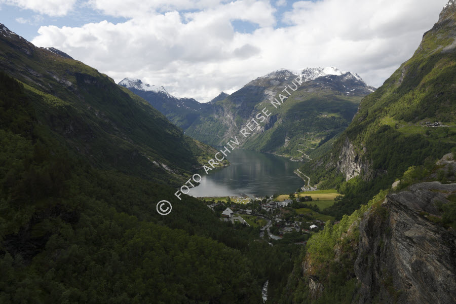 Dorf, Felsen, Felswand, Fjord, Fluss, Geiranger, Geirangerfjorden, Gewässer, Kulturlandschaft, Landschaft, Material, Møre og Romsdal, Norwegen, Stein, Wald,