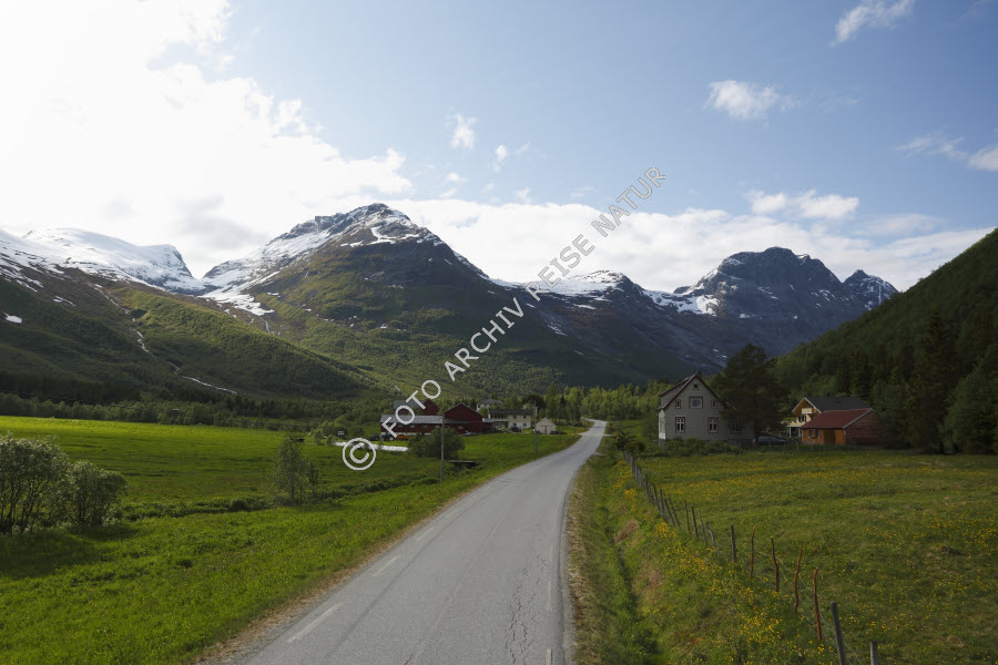Bauernhof, Baum, Bauwerk, Berg, Bergkette, Bergmassiv, Bergwald, Flora, Gebirge, Gebäude, Hof, Kulturlandschaft, Landschaft, Møre og Romsdal, Norwegen, Straße, Verkehrsweg, Wald, Weide,