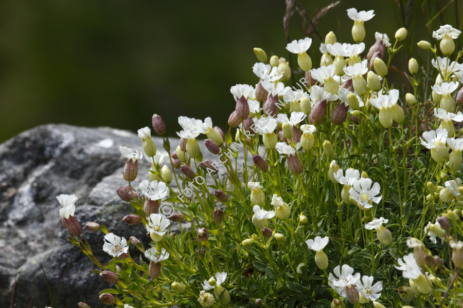Blume, Farbe, Felsbrocken, Felsen, Flora, Insel, Insel Runde, Landschaft, Material, Møre og Romsdal, Nelkengewächs, Norwegen, Stein, Taubenkropf-Leimkraut, Silene vulgaris, Wildpflanze, grün, violett, weiß,
