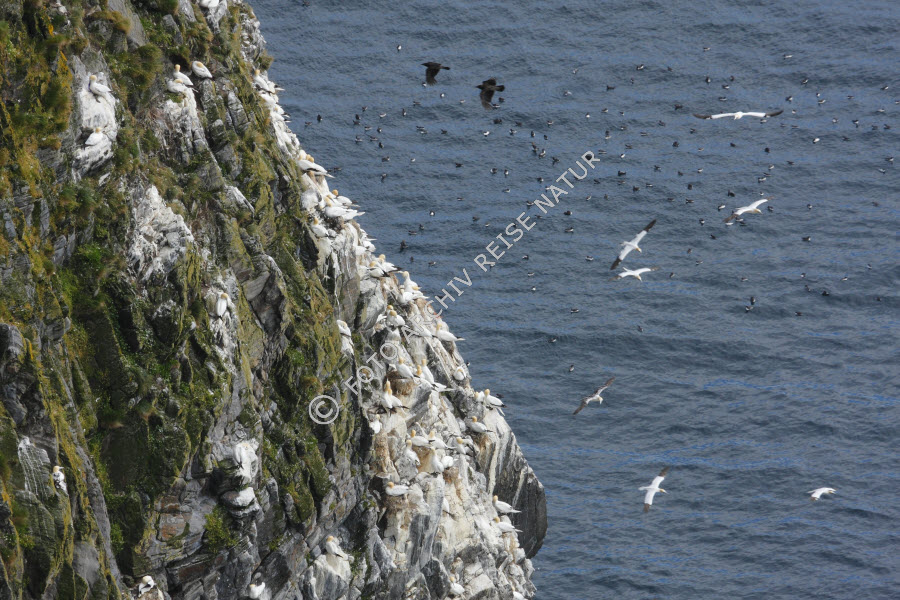 Basstölpel, Morus bassanus, Bewegen, Ereignis, Fauna, Felsen, Felswand, Fliegen, Flora, Geschehen, Gewässer, Gras, Insel, Insel Runde, Küste, Landschaft, Material, Meer, Møre og Romsdal, Nebelkrähe, Corvus corone cornix, Nordmeer, Norwegen, Rabenvögel, Segeln, Steilküste, Stein, Tätigkeit, Tölpel, Vogel, Vogelfelsen,