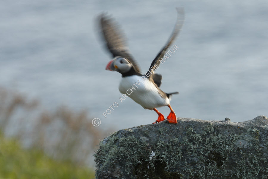 Alkenvögel, Bewegen, Ereignis, Farbe, Fauna, Felsblock, Felsbrocken, Felsen, Flattern, Fliegen, Flora, Geschehen, Gras, Insel, Insel Runde, Landschaft, Material, Møre og Romsdal, Norwegen, Papageitaucher, Fratercula arctica, Stein, Tätigkeit, Vogel, Wiese, Wiesenhang, rot, schwarz, weiß,
