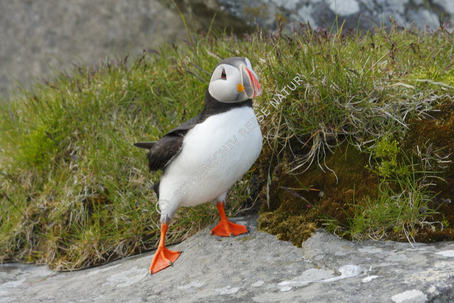 Alkenvögel, Farbe, Fauna, Felsblock, Felsbrocken, Felsen, Flora, Gras, Insel, Insel Runde, Landschaft, Material, Møre og Romsdal, Norwegen, Papageitaucher, Fratercula arctica, Stein, Vogel, grün, rot, schwarz, weiß,