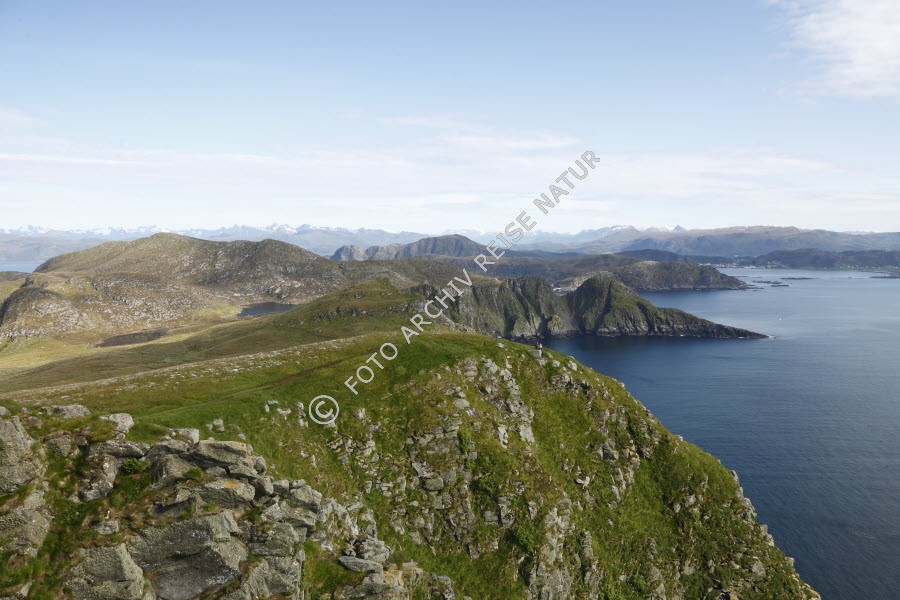Bergkette, Bergsee, Farbe, Felsen, Felshang, Felsklippe, Felsküste, Gebirge, Gewässer, Insel, Insel Runde, Küste, Landschaft, Material, Meer, Møre og Romsdal, Nordmeer, Norwegen, See, Steilküste, Stein, Wiese, Wiesenhang, blau, grün,