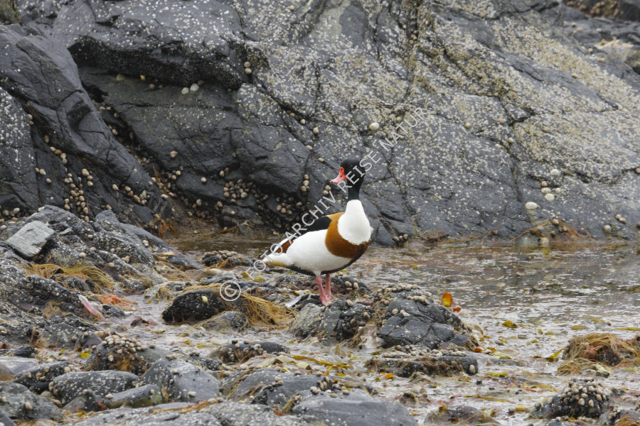Brandgans, Tadorna tadorna, Brandungsgeröll, Entenvögel, Fauna, Felsblock, Felsen, Felsküste, Geröll, Gewässer, Insel Runde, Küste, Landschaft, Material, Meer, Møre og Romsdal, Nordmeer, Norwegen, Stein, Vogel,