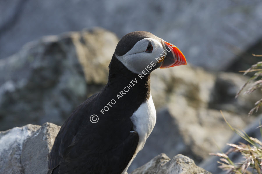 Alkenvögel, Fauna, Felsblock, Felsbrocken, Felsen, Flora, Gras, Insel Runde, Material, Møre og Romsdal, Norwegen, Papageitaucher, Fratercula arctica, Stein, Vogel,