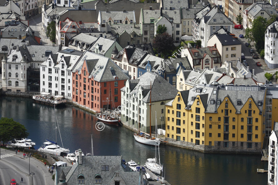 Altstadt, Baustil, Bauwerk, Dach, Dachgaube, Farbe, Gebäudeteil, Gewässer, Giebel, Hafen, Hafenmauer, Hafenstadt, Jugendstil, Kai, Kulturlandschaft, Landschaft, Meer, Møre og Romsdal, Nordmeer, Norwegen, Schindeldach, Stadt, Stadtansicht, Yachthafen, gelb, rot, Ålesund,