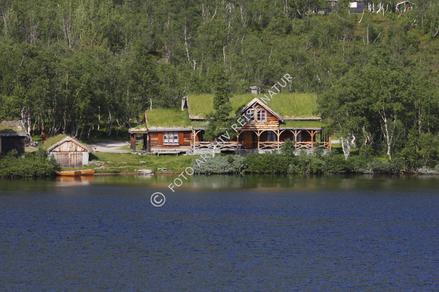 Baum, Bauwerk, Bergsee, Birke, Betula, Birkengewächs, Bootshaus, Dach, Flora, Gebäude, Gebäudeteil, Gewässer, Gjøra, Gras, Grasdach, Haus, Holzhaus, Landschaft, Møre og Romsdal, Norwegen, See, Vangshaugen, Wald, Wiese,