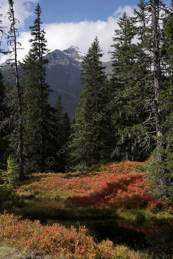 Berg, Bergwald, Blaubeere, Vaccinium myrtillus, Fichtenwald, Flora, Gewässer, Gipfel, Heidekrautgewächs, Hocharn, Hohe Tauern, Kolm Saigurn, Landschaft, Nadelwald, Nationalpark, Ort, Rauris, Rauriser Urwald, Salzburger Land, Tümpel, Wald, Österreich,