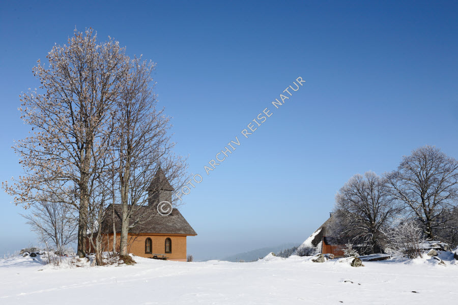 Baden-Württemberg, Baum, Baumstamm, Bauwerk, Deutschland, Farbe, Flora, Gebäude, Jahreszeit, Kapelle, Kirche, Krone, Niederschlag, Rauhreif, Sakralbau, Schnee, Schneefeld, Schwarzwald, Strauch, Triberg, Wetter, Klima, Winter, Zeit, blau, weiß,