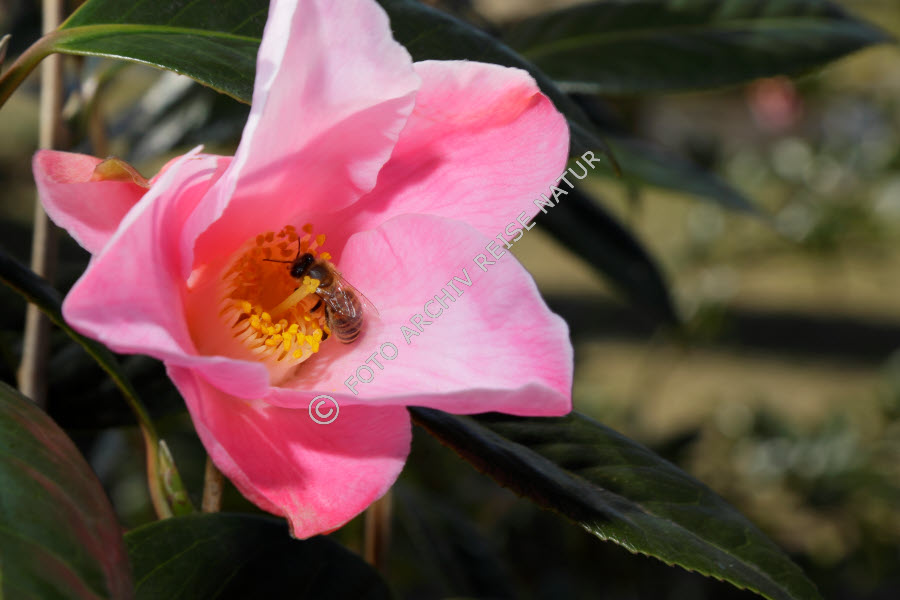 Biene sammelt Nektar in Kamelienblüte